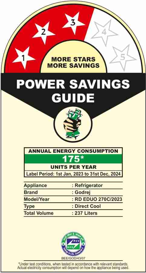 The Godrej 237L Direct Cool Refrigerator (Model RD EDUO 270C/2023) offers reliable cooling with energy efficiency. Designed to consume only 175 units of electricity per year, this refrigerator is perfect for families seeking to minimize power costs. With a spacious 237-liter capacity, it provides ample storage to keep food fresh, making it a practical and economical choice for the modern home.