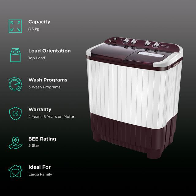 Singer 8.5 kg 5-Star Semi Automatic Washing Machine with Pro Spin Pulsator (Maestro Clean SM 8500, White and Maroon)